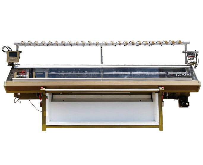 本公司最新研發(fā)的擁有自主知識產(chǎn)權(quán)的“華倫飛虎”牌2+2/3+3型電腦橫機采用雙機頭雙系統(tǒng)/雙機頭三系統(tǒng)編織系統(tǒng),除具備單機頭雙系統(tǒng)/單機頭三系統(tǒng)的所有功能以外,機頭可以自由合并成四系統(tǒng)/六系統(tǒng),豐富織物組織。電腦控制界面采用LCD菜單形式,使得操作簡單易懂。機型編織內(nèi)容豐富,主要用于羊毛衫的自動編織,適用于絲、棉、毛、滌綸、混紡等原料,可編織雙面提花、單面提花、單面無虛線提花、挑洞、絞花等花型。
